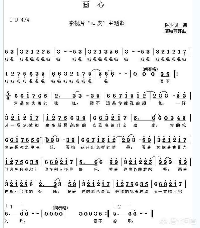 《画心》中的最高音出现在4分47秒处(针对7分12秒的《画心》而言),达到了小字三组的b3,也就是High B。《画皮》插曲 “小唯”的简谱